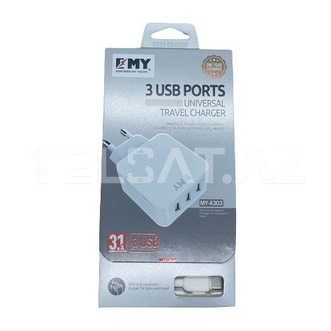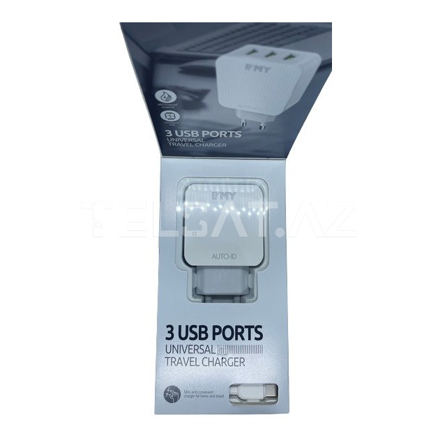 EMY 3 USB Port MY-A313 Şarj Cihazı, həm ofis, həm də ev üçün əla bir əlavədir və müxtəlif cihazları eyni anda şarj etmək üçün əla bir həll təşkil edir.