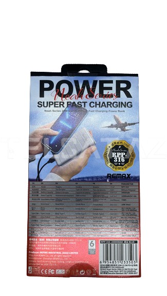 REMAX RPP-316, Noah seriyası ilə təqdim olunan 20000 mAh gücündə bir power bankdir və həm də USB Power Delivery (PD) və Quick Charge (QC) texnologiyalarını dəstəkləyir. Bu cihaz, mobil cihazlarınızı tez və effektiv şarj etmək üçün əla bir seçimdir.